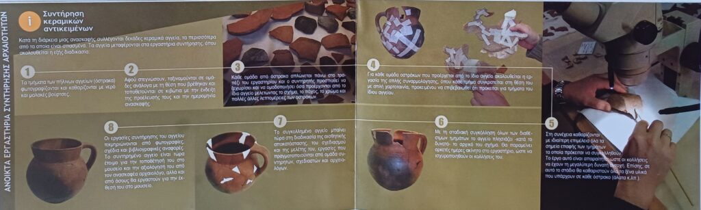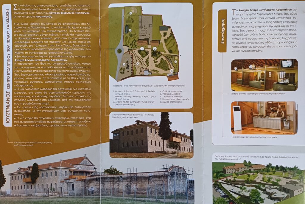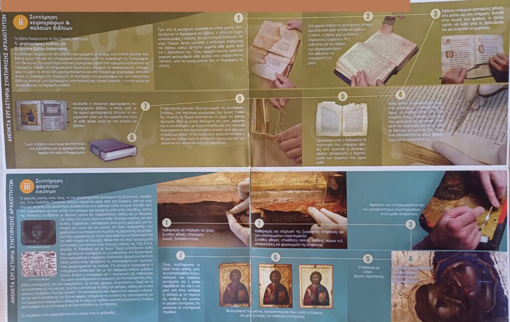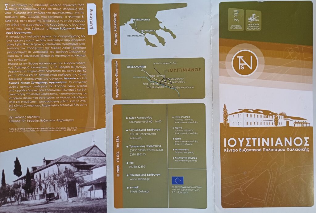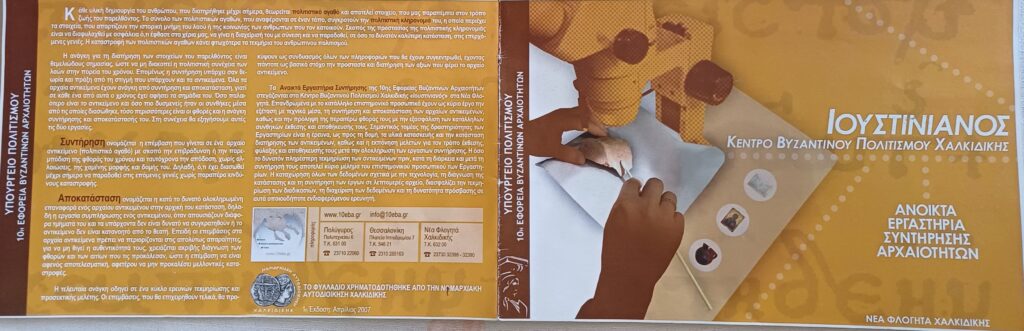Παραπάνω παρουσιάζονται τα δύο ενημερωτικά φυλλάδια που εκδόθηκαν για τους επισκέπτες του “ΙΟΥΣΤΙΝΙΑΝΟΥ” από τον γράφοντα και τους συνεργάτες του μετά την έναρξη λειτουργίας του Κέντρου “ΙΟΥΣΤΙΝΙΑΝΟΣ” – ένα για το συνολικό έργο της δημιουργίας του Κέντρου και ένα για το έργο των συντηρήσεων, που πραγματοποιούνται από τους συντηρητές στα τρία εργαστήρια [1. κεραμικών, 2. φορητών εικόνων και 3. χειρογράφων] – σε άμεση αλλά ασφαλή οπτική επαφή των επισκεπτών με το έργο των συντηρήσεων.